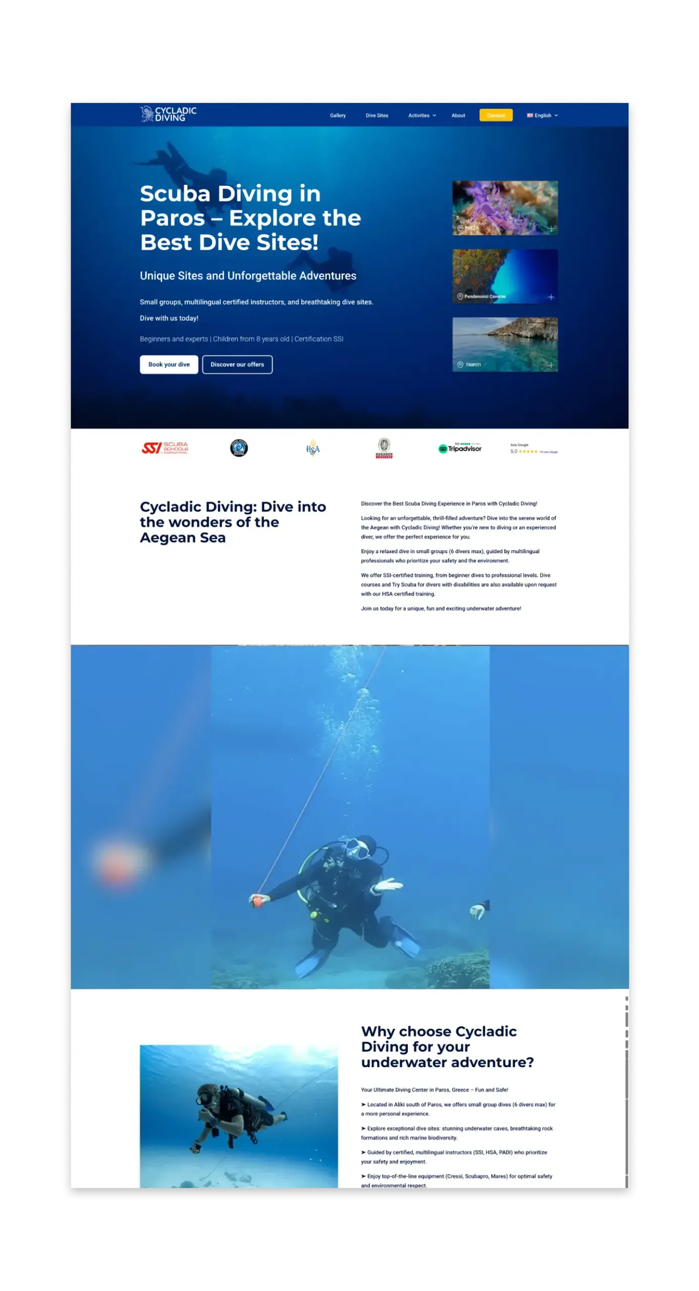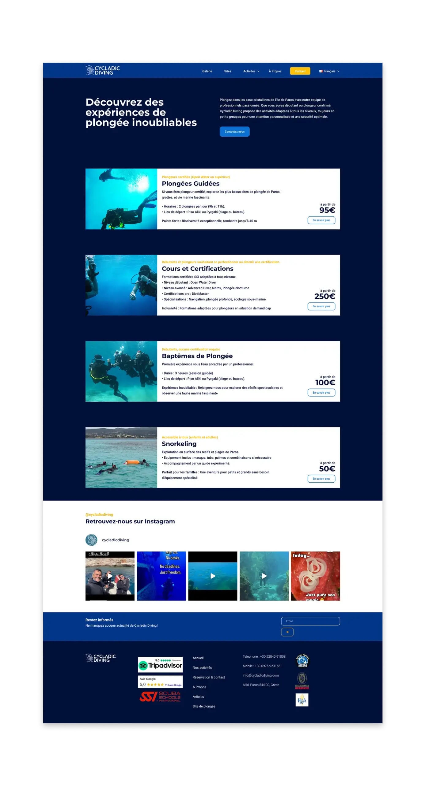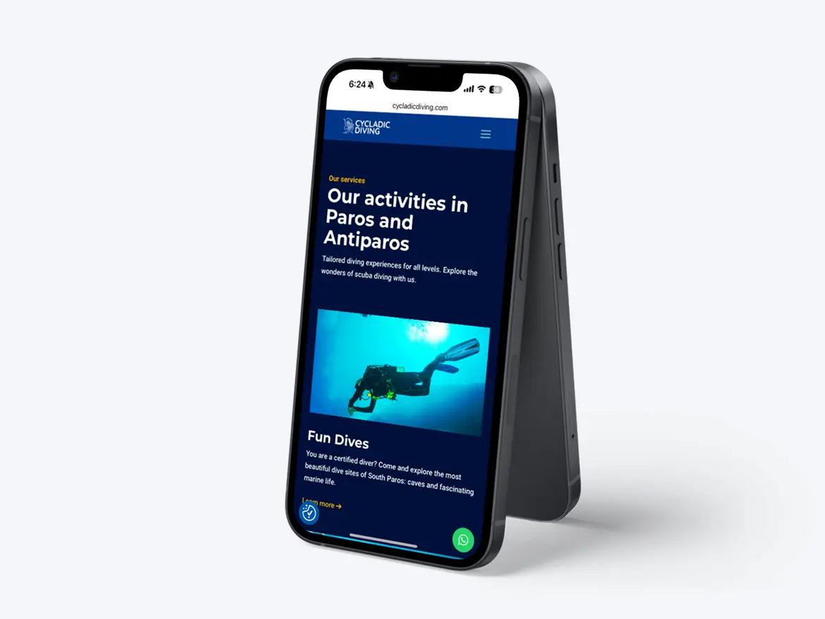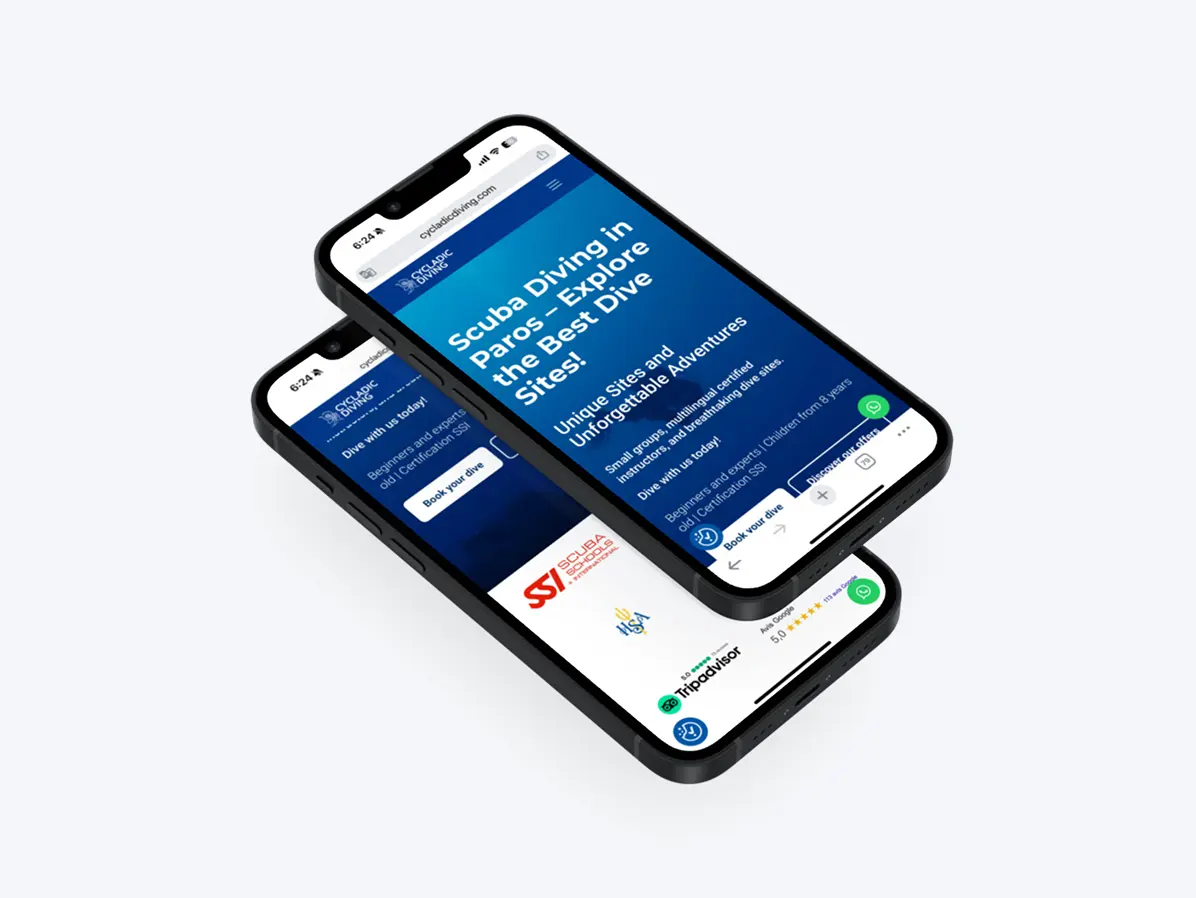 Cycladic Diving, a local diving center in the Cyclades, needed more than a visual refresh. Their old website was outdated, complex to manage, and ineffective in generating reservations. Our mission: rethink the entire digital experience, from visibility and UX to lead generation and ROI tracking. The goal was simple: turn online visits into underwater bookings.